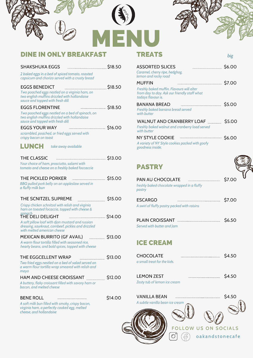 Welcome to Oak & Stone Cafe, a gem nestled in Woodend, VIC. This café delights with a menu that combines comfort and creativity. Start your day with their Shakshuka Eggs, featuring baked eggs in a rich, spiced tomato and chorizo base, perfectly complemented by crusty bread, all for just A$18.50. Fans rave about the classic Eggs Benedict and Eggs Florentine, each crafted with care and flavor.
